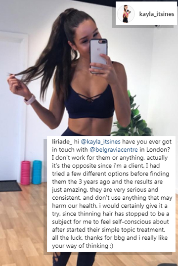 Kayla termine son poste avec un appel pour ses adeptes pour s'ouvrir sur leurs propres problèmes de hairloss dans le but d'aider les gens à se sentir plus à l'aise avec leurs insécurités. Elle semble avoir appuyé sur quelque chose, car ses mots ont suscité plus de 75 000 amoureux et de nombreux commentaires, y compris d'autres femmes qui perdent leurs cheveux. En réponse à l'admission de Kayla qu'elle utilise extensions de cheveux clip-in un de ses adeptes écrit que son coiffeur lui a donné quelques extensions lui ayant assuré qu'ils seraient en sécurité si elle Devaient lui donner beaucoup de pauses.
